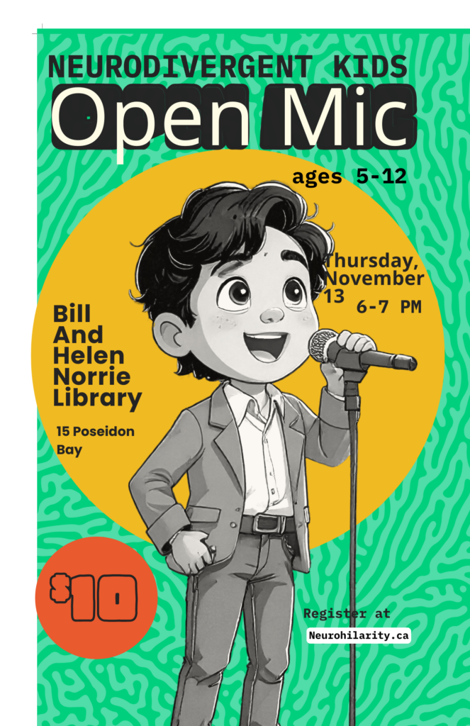 Neurohilarity Shows Ticket link below https://www.zeffy.com/en-CA/ticketing/february-7th-neurohilarity. Click here to register for Neurodivergent Kids open mic.